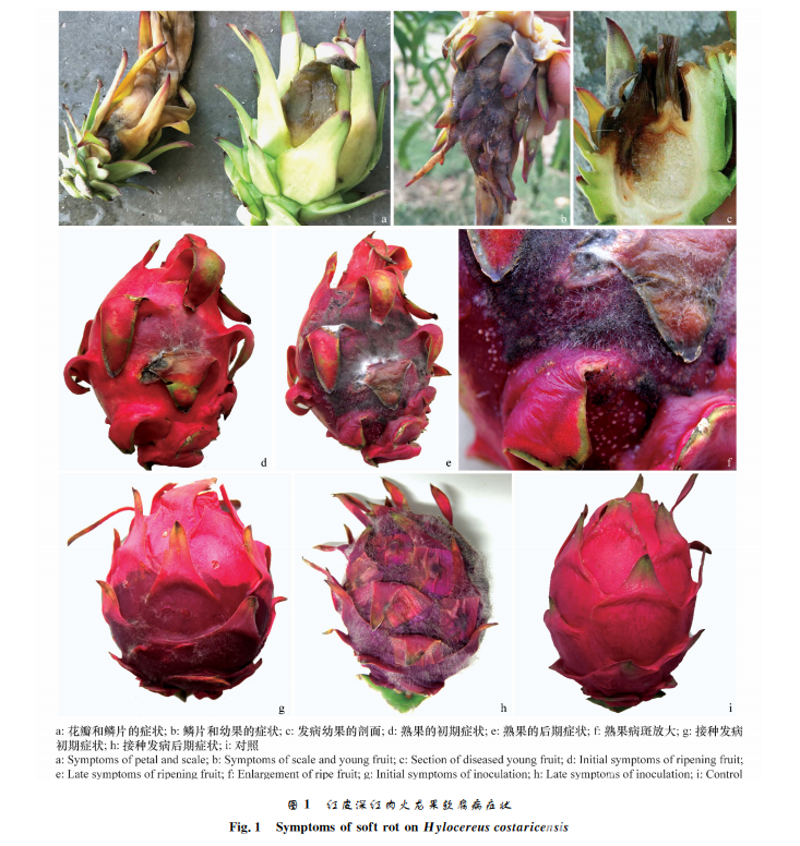 對健康的紅皮 深 紅 肉 火 龍 果 果 實 進 行 接 種,以 無菌的 PDA 為對照,5d后針刺傷接種的果實全部 發病,接種產生的癥狀與田間發病的癥狀相同(圖 1g~h),而對照果實不發病(圖1i)。對發病組織進 行再分離,可得到與原分離株相同的病原菌,符合柯 赫氏法則,證明接種菌為火龍果軟腐病的致病菌。