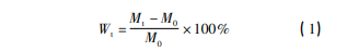 利用恒溫恒濕箱,使面板復合材料、PMI 泡沫 和 PMI 泡沫夾層結構復合材料試樣在相應環(huán)境 中持續(xù)吸濕。在吸濕的前 24 h,每 12 h 對其吸濕 率 Wt 進行測試; 24 h 后,每 24 h 對吸濕率 Wt 進 行測試。本文使用稱量法表征試樣的吸濕率 Wt ( 見式 1) 。