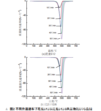 將尼龍612、尼龍612/6共聚物樣品在真空干燥 箱中干燥,時間12 h、溫度 115℃、真空度0.1 MPa;在 真空環境中冷卻,取樣2~3 mg。在熱重分析儀中 保持N2吹掃,流量40 ml/min,然后分別以10、20、30、 40、50℃/min的升溫速率由室溫升至650℃,記錄物 質質量隨溫度與時間的變化關系,得到熱失重(TG) 及其一階微分曲線(DTG)。