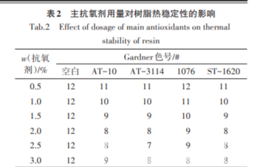 在四種主抗氧劑單獨使用情況下,同等量的抗 氧劑 AT-3114 對 C5 石油樹脂抗熱穩定性改善效果 最好,抗氧劑 1076則表現最差,推測為 1076在三種 固體抗氧劑中熔程最低,在高溫老化狀態下對自由 基捕獲性能和抗揮發性較差。而唯一的液體主抗 氧劑 ST-1620 的熱穩定性測試結果介于 AT-10 與 AT-3114之間,說明其在高溫下的抗熱氧性能與其 較低的熔程無關。